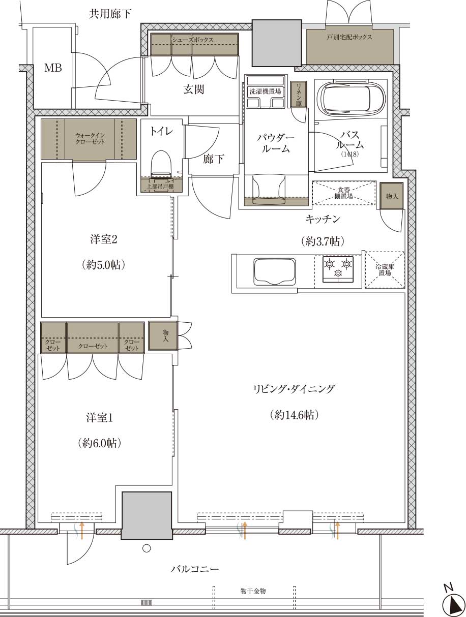 南面に2つの洋室を配した、開放的な3LDK南西角住戸。