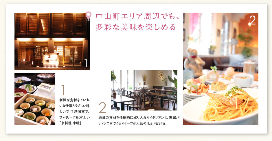 閑靜な住宅街の中山町エリア周辺にも、隠れ家のような洗練されたお店があります。京情緒を味わえる和料理店から、コーヒー一杯からしっかり食事までできるカフェが徒歩圏內(nèi)にあり、さらに歐州レストランやバーなど行きつけにしたい素?cái)长胜辘c(diǎn)在します。