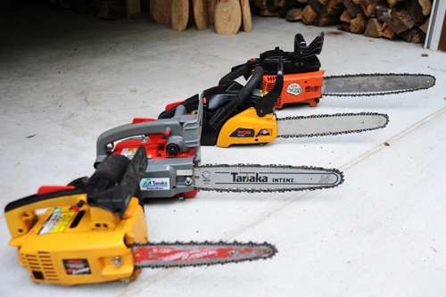 この寫真には4臺のチェーンソーが並べてありますが ガイドバー(刃が付いている所)が長い物や 先がとがったものなど形の違いがわかるかと思います