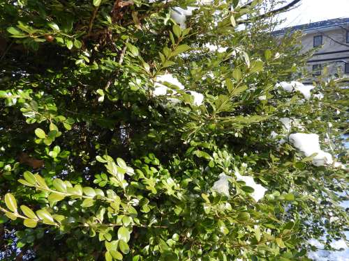 昨年の冬も雪が少なかったため、如月朔日(2月1日)に散歩した様子をブログ上で話題にしました。今年も余裕でお散歩できそうです。キレイな色をさがすため今年も冬の散歩に出かけてみました。出かけてすぐに、少量の雪を載せた、ツヤツヤとした緑の葉っぱの植え込みをみつけました。リゾート內(nèi)ではよく見かける植物で、あちらこちらで見かけます。日差しを受けて、それはもう「ツヤツヤ」。冷たい風(fēng)に負(fù)けていません。