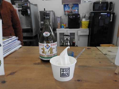 寫真にあるのが「大人のソフト」。以前に地元のテレビ番組で紹介されていました。今日は歩いて來てますので、堂々とべられます。なぜ、そんなことを気にするかというと、トッピングが「お酒」だからです。テレビで案內役のサンドウィッチマンが食べていたのと同じ、黒糖焼酎をトッピングしたものをいただきました。お店のご主人は、ずいぶん試行錯誤を繰り返したそうです。ご主人とあれこれおしゃべりしながら、じっくりと味わい、たいそう美味しくいただきました。観光客のみなさまにも、ぜひご賞味いただきたいものです。子供さんや、お酒はちょっとという方は、トッピングなしでどうぞ。