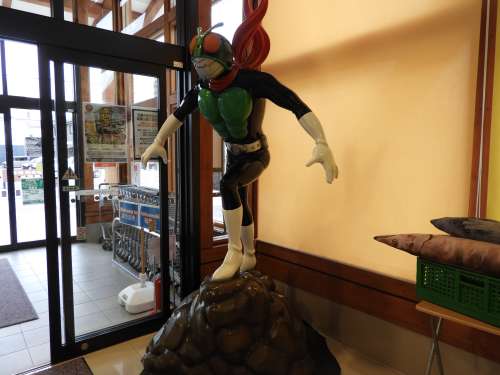 なんだ、なんだ、何が始まった?と思いますよね。話題がないなら過去に戻ってみよう、と思った結果がこれです。ブログ用にたくさん撮影して日の目を見なかった寫真を改めて眺めてみて、頭に浮かんできた歌などをツラツラと文章にしたためてみることにしました。この寫真は、いつぞやご案內した宮城県石巻市の復興げんき市場內に設置されている「仮面ライダー」です。これを見たら、やはり主題歌が頭に浮かびます。初代仮面ライダーが登場したのは昭和46年。現在も続く仮面ライダーナンタラカンタラは、私のような年配者には、さっぱりわかりません。やはり、藤岡弘演じるところの本郷猛でなければ。主題歌も、藤岡弘さんご自身が歌っていたんですよ。仮面ライダーの橫の方にチラリと見えるものは、魚のぬいぐるみです。なにせ、市場ですので。