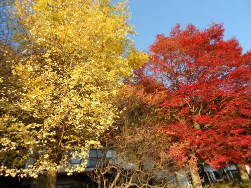 蔵王町遠刈田溫泉中心部に位置する、「刈田嶺神社」境內のモミジとイチョウです。そんなに大きな木ではありませんが、赤と黃色のコントラストが実に見事ですね。紅葉の名所は、全國にごまんとあるでしょうが、刈田嶺神社の彩り見事なこの2本の紅葉の様は、十分胸を張って誇れるものだと思います。