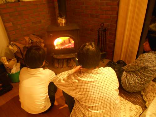 ~ 雪の降る夜は楽しいペチカ、ペチカ燃えろよ お話しましょ...... 大正13年唱歌「ペチカ」 ~ どこがペチカだ、フツーのストーブじゃないの、とお叱りの聲が聞こえそうです。ペチカがどんなものなのか、言われてみるとよくわかりません。調べてみたところ、ロシア風暖爐ということで、ストーブと比べて、形からしてそんなに違うものではなさそうです。ペチカにせよストーブにせよ思い浮かぶのは、家族が火の回りに集まり団らんのひとときを過ごす、この歌の歌詞のような、暖かなゆるやかな時間。この寫真は、たびたび蔵王の我が家にやってくる私の後輩たちがストーブを囲んでいるところです。ストーブには、炎には、心を穏やかにさせてくれる魔法があるのです。
