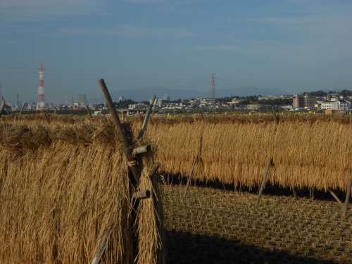 稲の天日干しが當たり前だった頃に育った人間から見れば、珍しくもない光景ですが、機械乾燥が主流となった今では、あまり見かけることはなくなりました。この光景には、稲刈りがすっかり終わった田んぼを散歩中に遭遇しました。稲のこの干し方は「はさがけ」と言って、私の子供の頃住んでいた地域でもこの干し方が多く、稲を干していない時は鉄棒代わりにして遊んだものです。
