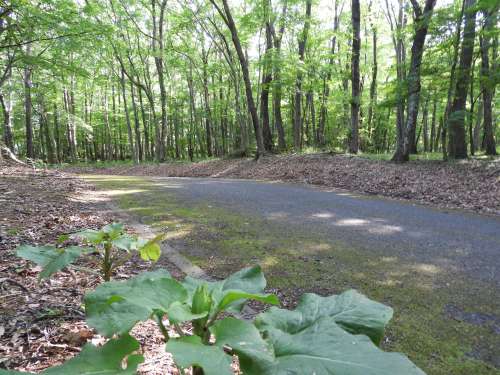 緑のボリュームを増した葉っぱに彩られた木々が濃い陰影を作り出しており、路上に目を向けると、うっすらと苔が育ち始めています。手前には、昨年もご紹介したウバユリが、花の準備を始めています。初夏の輝きの中で、それぞれがそれぞれの仕事を全うしているようです。
