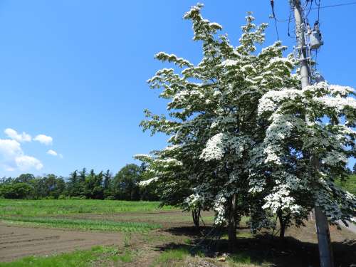 山においては、お仲間のヤマボウシが真っ白な花を(たまにピンクもありますが)咲かせ太陽の光を反させて、キラキラと木全體を輝かせています。山にあるヤマボウシは大木が多く、數え切れないほどの花を咲かせます。白い花というのは一見地味に感じますが、初夏のクリアな光を浴びると、俄然輝きを増します。