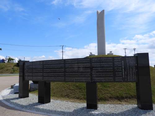 多くの被災(zāi)地で、海岸付近に復(fù)興公園を造成し、津波発生時(shí)の避難場(chǎng)所を兼ねたタワーや丘などを整備しています。閖上においても公園の中に、慰霊塔と、津波で犠牲になった964名の芳名碑が建立されていました。現(xiàn)天皇皇后両陛下が、閖上を被災(zāi)地訪問(wèn)された際に詠まれた和歌も刻まれています。