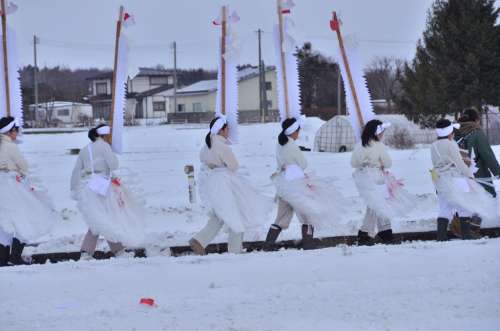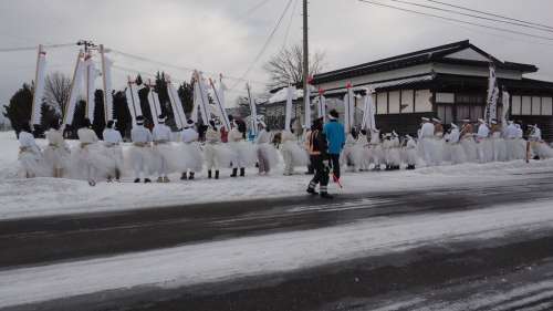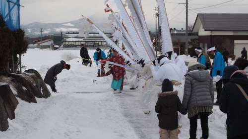 それにしても、八幡平や前森山から吹き降ろす風が、田んぼ道の一行を容赦なく叩き、験竿が四方に倒れている。風邪をひかぬように!無事に到著できますように!祈り返したい心境であった。
