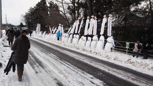 裸參りと言っても実際には上半身裸の人が3人、その他はしっかり著込んでの白裝束である。中にはワラジの人もいる。口に白い紙を咥えているのは悪霊が體に入るのを防ぐ意味があるという。