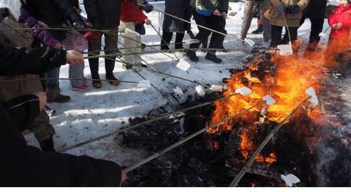 神奈川では自治會の更に下の???組と言われる単位で”どんど焼き“と稱して行われ、我が家でも2度ほど當番をしたことがある。こちらほど厳かではなく、30軒ほどの単位だったので、田んぼの狹い農道で”のぼり“を上げて焚き上げを始めると、5~6人が顔を見せる程度。自分たちが用意したお神酒と乾きもので談笑しつつ、アルミ箔で包んだ持參の団子を焼いて帰る。