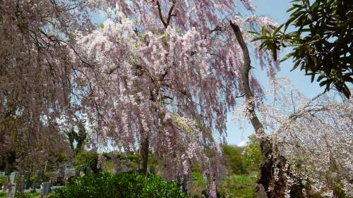 江戸時代に、京都から紅枝垂桜の苗木を持ち帰り植えた記録が殘っているこのお寺では、毎年桜の咲くこの季節(jié)に、多くの方がお花見に訪れます。