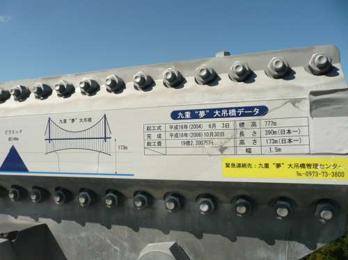 橋の中ほどに、吊橋の概要が記載されたプレートがありました。 長さ、高さとも日本一とのことですが、 谷からの高さ173mゆうのは、なかなかですぃね 高さ比較で、ピラミッド146mとありましたが、