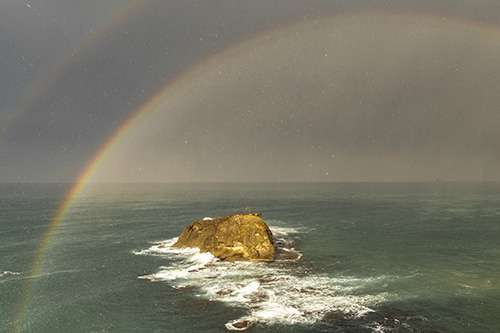 鳥居立つ淤岐ノ島を囲むように虹のアーチが。