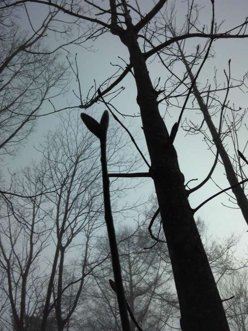 「樸の木」芽が空に向かってぱっくりと開いた