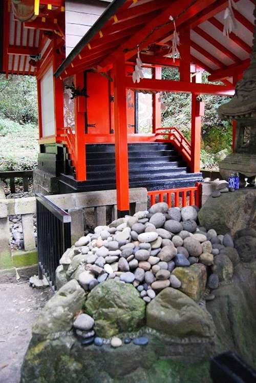 安産や子どもを授かりたい方はお參りをして、 境內の小石を頂いて持ち帰ると玉のような元気な子を 授かると云い伝えられます。 無事に安産を終えたら、そのお返しとして、 河原の清浄な小石を拾い、もう一つ石を添え二つにして返します。 次の妊婦さんのために、そして神様への感謝の意を込めて倍に して返すのだそうです。 戌の日には、神主さんのご祈禱があり、 地元の方だけでなく遠くからも參拝者があるといいます。 社殿の前の石塔や社殿橫には、 安産の願いや生まれてきた子どもの名前と共に、 お禮のメッセージが書かれた小石が沢山並んでいました。