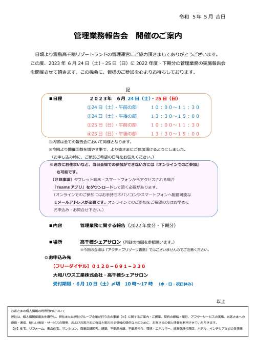 日ごろは、當リゾートの管理運営にご理解、ご協力を頂きまして