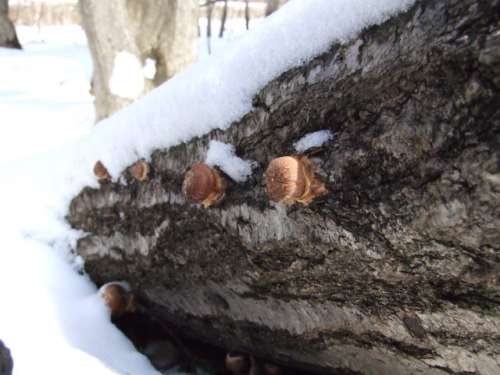 雪の下に見つけた、原木シイタケの芽だしです。(そういう表現(xiàn)なのでしょうか。菌なので「発生」?)
