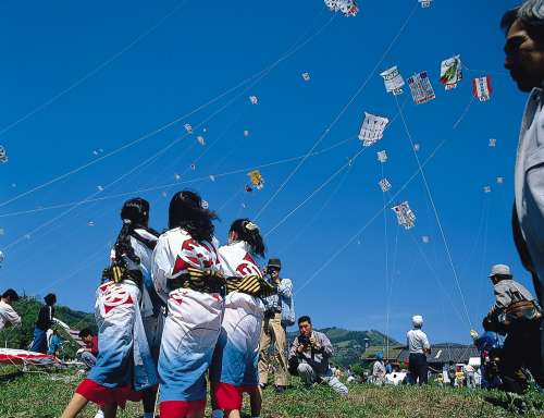 両親が願いをこめてその年生まれた赤ちゃんの名前を書き大空にあげる出世凧は、3m×4mもあり、大人が4~5人以上はいないとあげることができません。
