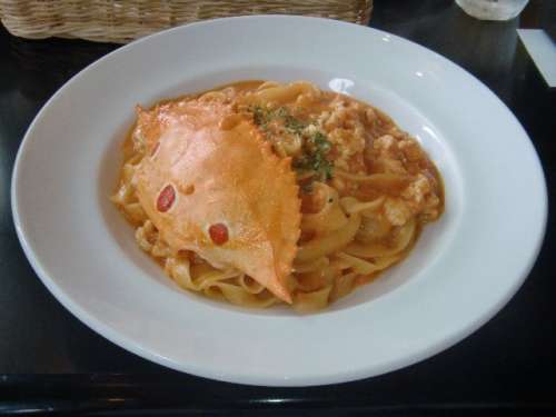 蟹味噌と蟹の身が混ざりトマトソースと絡まり見事なハーモニーを演じています「この蟹のパスタは美味いカニ~」と呟くと周りの女性達受けています