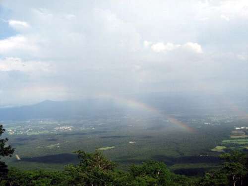 まわりに視界をさえぎる樹木が無い分、舊道からの山麓の眺めは格別だ。眼下に広がる広大な牧草地を大きな雲のジョウロがゆっくりと移動しながら潤して行く、雨が過ぎ去った後には二重の虹が広がる。我々はあの雲や虹の下で雨が降った、止んだと一喜一憂している、人間はこの大きな自然の摂理の中のほんの一部でしかない、そんな事にあらためて気付かされる。
