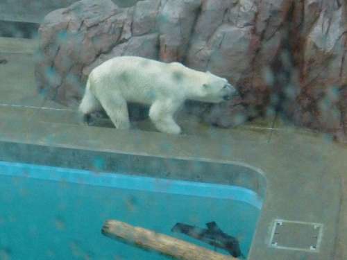 この白クマの“豪太”の為に2006年5月に人口降雪機を設置し、“豪太”の夏バテを抑える様にしたそうです、周りに確かに“雪”があります