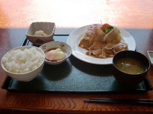 「來ましたですよ~!これが噂の杜仲茶ポークの生姜焼き定食ですよ~!」半熟卵も付いています、お肉を頂きます「う~ん!何とジューシーな食感でしょうか??甘さとやわらかさが、見事にマッチしています」私はご飯に半熟卵をかけて(卵かけご飯にして)少し贅沢な食べ方をしながら生姜焼きを頂きます