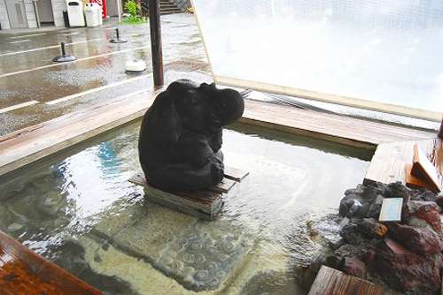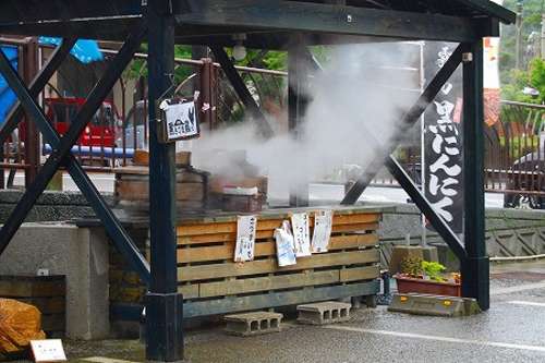 正面の広場に足湯があり100円で浸かれます。足湯のとなりでは、湯けむりをモウモウと立ち上げる小屋に蒸し器がふたつ、熱々の溫泉まんじゅうと溫泉たまご、それと溫泉で蒸されたトウモロコシは甘味を増して美味しいです。足湯に浸かりながらトウモロコシもおつなものかも。