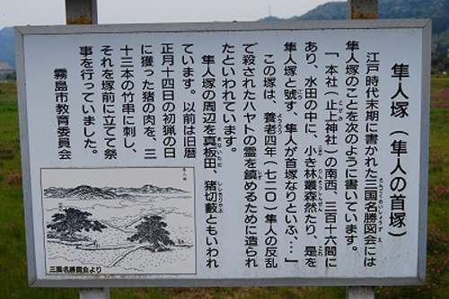 九州南部の人々は7世紀後半ごろから隼人と呼ばれていたました。5世紀末ごろから徐々に大和朝廷の影響が浸透していましたが、大寶律令が施行された時點でも依然として律令支配の及ばない地域でした。そこで720年3月、大和朝廷は隼人の征討にあたらせました。 隼人は大和朝廷の支配に抵抗、初代大隅國司を殺害されたことに憤怒し、大伴旅人を將軍に1萬人ほどの兵隊を南九州に送ります。 720年、現在の霧島市國分平野の一帯が舞臺となり、大和朝廷が隼人族を鎮圧したのが「隼人の亂」と呼ばれる事件です。隼人側は數千人の兵が集まり7ヶ所の城に立て籠もったそうです。これに対して大和朝廷側は九州各地から1萬人以上の兵を集めました。大伴旅人らは九州の東側および西側からの二手に分かれて進軍し、6月18日には5ヶ所の城を陥落させたと朝廷に報告しています。 1年半近くにわたった戦いは隼人側 の 敗北で終結し、721年7月8日、勝利した朝廷軍は隼人の捕虜を連れて都に戻りました。隼人側の戦死者と捕虜は合わせて1400人であったと伝えられています。以後、隼人の組織的な抵抗はなくなり最終的には強制的に中央に移住させられ、守護人(まもりびと)として宮殿の警備をする仕事や竹製品作りの仕事に従事させられました。 霧島市隼人町には、隼人の亂に関係する史跡として「隼人塚」(國指定史跡)があります。高さ約3mの丘(盛土)の上に、多重石塔3基と、四天王石像4體が立っています。 また、國分重久地區にある止上神社近くにも、隼人の亂の激戦地になったと云われる「隼人塚」があります。この地區の住民は、毎年1月14日に捕れた豬の肉を33本の竹串に刺し、鎮霊祭を行っていたそうです。 大分県宇佐市の宇佐八幡宮では、現在もこの隼人の亂で亡くなった隼人族の霊を慰めるために放生會(ほうじょうえ)が行われます。また、隼人族の最後の首長こそ曽於市に伝わる「彌五郎どん」だと云われています。
