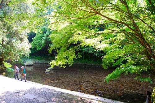吾平山上陵は全國でも珍しいとされる巖屋の陵で、500メートルほど続く砂利の參道は、緑が美しく、そして川のせせらぎも優(yōu)しく流れ、まさに神々しい雰囲気を醸し出していました。小さいですが、その佇まいはなんとなく三重のお伊勢さまに似ていると思いました。ウガヤフキアエズノミコトの御霊は宮崎県の鵜戸神宮に祀られています。