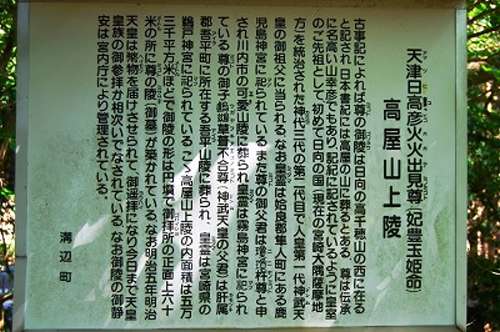 ここ「高屋山上陵」は山幸彥(ホオリノミコト)の御陵(天皇家の墓)とされ“神代三上陵”のひとつで、薩摩川內(nèi)市の可愛(えの)山上稜、鹿屋市吾平町の吾平(あいら)山上稜、に並ぶ神代の皇室の墳?zāi)工瑢m內(nèi)庁管理のもと治められています。山幸彥(ホオリノ