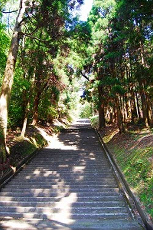 霧島市溝辺町の國道504號を北へ4キロほど進(jìn)むと、右前方にこんもりとした小高い森が見えてきます。様々な種類の木々が生茂り、巨樹の木立が並ぶ真っ直ぐとした石段を上ると拝禮所がありました。昭和天皇や今上陛下が皇太子の頃に美智子妃と御參拝された碑が建っています。昭和天皇が御參拝された折には元師海軍大將 東郷平八郎が付添人として參拝されたようです。