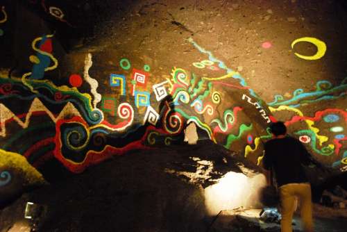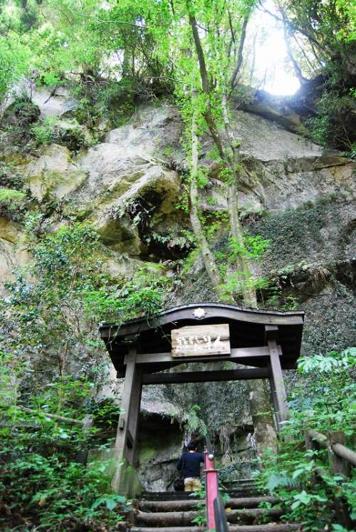 現(xiàn)在の霧島市國分平野に 古代神話で “熊襲”(くまそ) と呼ばれる 部族が住んでいました。 (後に、隼人族の祖 とも言われています) 熊のように猛々しく、勇ましい人々だったとされ、大和朝廷に抵抗し、 景行天皇の息子: 日本武尊(やまと たけるのみこと) の熊襲討伐の物語は古事記や日本書記にも登場します。 その熊襲族が住居していた穴とされる 「熊襲の穴」が、 霧島市隼人町の「妙見溫泉郷」にあります。 熊襲の首領(lǐng): 川上タケルは、 女裝した日本武尊によって殺害されました。 この時、川上タケルが息絶える直前に 日本武尊と命名したことから、一名嬢著(じょうちゃく)の穴ともいわれます。 國道223號沿いに案內(nèi)表示があって そこから山道を上って行きます。 辿り著いたのは 大きな巖肌の下に少し空間が空いた場所。 身をかがめながら巖の隙間から中に入ると、大きな空間が広がります。 奧行き22メートル、幅10メートル、高さ6メートルの広さだそうです。 壁には鹿児島県出身の 前衛(wèi)畫家:萩原貞行氏に よる古代熊襲族をイメージ した様々な図柄が描かれていて神秘的な空間です。 熊襲の住居というよりも、 神事をなど執(zhí)り行ったところではないかと感じました。