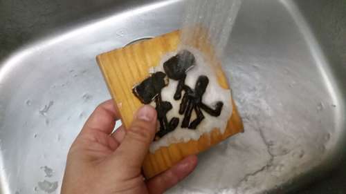 2.液狀ノリを原図裏面全體に塗り、板に貼り付けます。