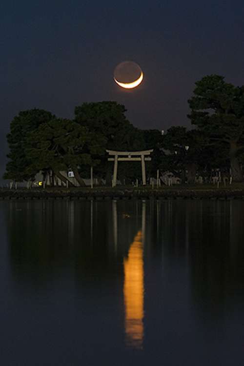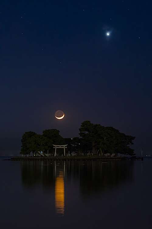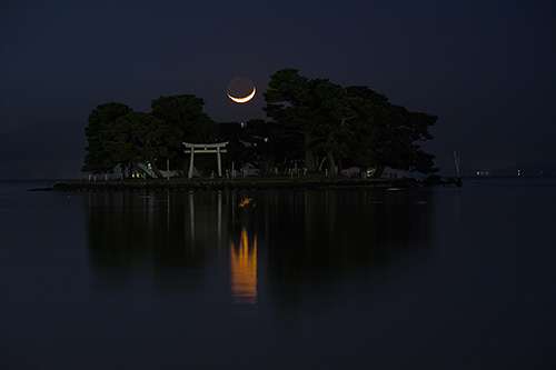 嫁ヶ島の向こうに沈む夕日観たさに 県外からも多くの観光客が訪れていますが、 実は夜、こんなも美しい月の沈んでいく様子が ご覧いただけることを知る人は多くありません。