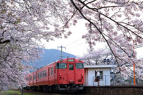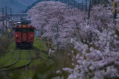 そこで今回の特集は、4月といえば桜ということで、 桜を奏でることのできるマニア必見の駅をご紹介。 JR山陰本線、巖美町に位置する大巖駅は 撮り鉄ファンなら誰もが知る全國屈指の桜列車が 撮影できるポイント。 無人駅ならではのトリップ感満載の ホームに沿って數百メートル。 線路沿いに見事に咲く桜の橫をゆっくりと 列車が走るそのさまはまさに雅な桜列車。 この場所を求め、毎年多くのファンが押し寄せてきます。