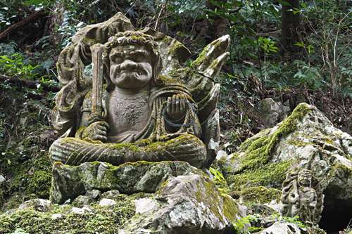 途中の山肌には不動明王像の姿、 根本堂橫の護摩堂には不動明王がお祀りしてあります。