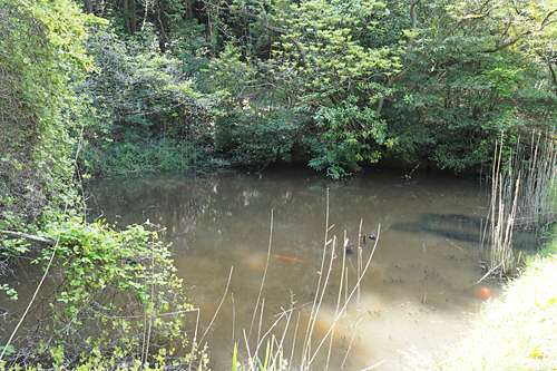 駐車場に車を停め、黃泉比良坂へ向かう途中には 濁った池があり、鯉が泳いでいたのですが、 その近くに何やら黒い物體が。