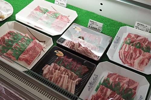 鳥取和牛が味わえるバーベキューキャビンは、 ご飯や野菜に牛乳などはバイキング形式の 食べ放題?飲み放題。 入り口には、と~っても美味しそうなお肉が 並べられていました。