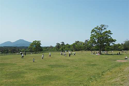 施設の前にはキレイな芝の広場があり、 ボール遊びをする親子や、レジャーシートを広げて のんびりとくつろぐ人など、 思い思いに楽しむ人の姿。