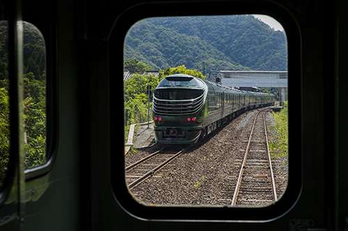 通常運行の列車から 眺める瑞風。 特別な場所を走るのではなく、 日々のダイヤのなかでその合間をぬって 瑞風は走っていきます。 だからこそ、 こんな偶然にも出くわすことが。