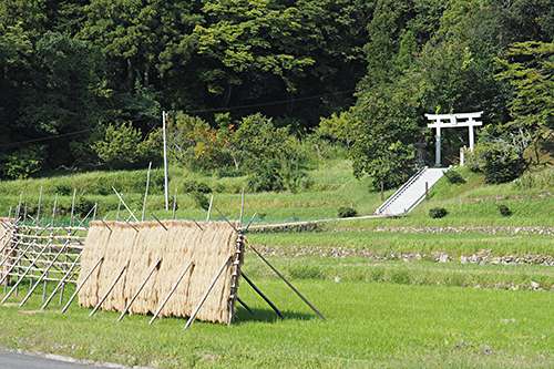 収穫を目前に控えた稲や、 収穫され干されている稲を橫目に 300メートル程歩くと參道に到著です。