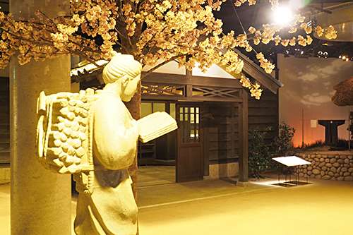昔の小學校でよく目にした二宮金治郎の像や、 茅葺き屋根の民家があり、 障子にはわらべ歌で遊ぶ子どもの影絵が浮かびます。