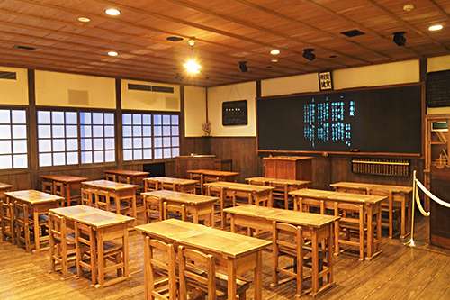歩を進めると昭和初期頃の木造校舎が再現されていて、 教室が唱歌コーナーになっています。