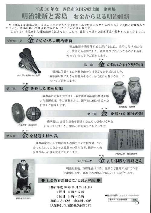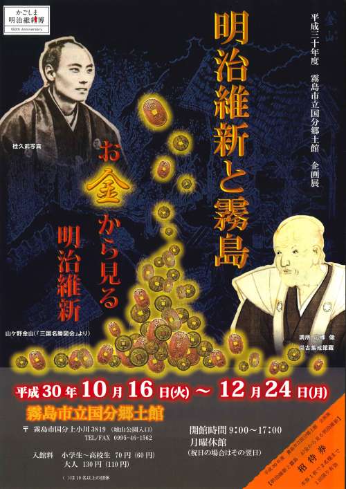 霧島市社會教育課にて10月16日(火曜日)から12月24日(月曜日)まで霧島市立國分郷土館で「明治維新と霧島?お金から見る明治維新」をテーマに歴史が紹介されています。