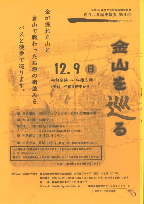 霧島の歴史巡りの一環として、霧島市教育委員會教育課 文化財グループにより、第4回目の「きりしま歴史散歩」が開催されます。今回は金が採掘された山と金山で賑わいを見せた石垣の街並みを巡ります。山ケ野地區から永野地區の周囲約12 キロの山間部は、日本一の金山として賑わった場所で薩摩藩の財源にもなっていました。