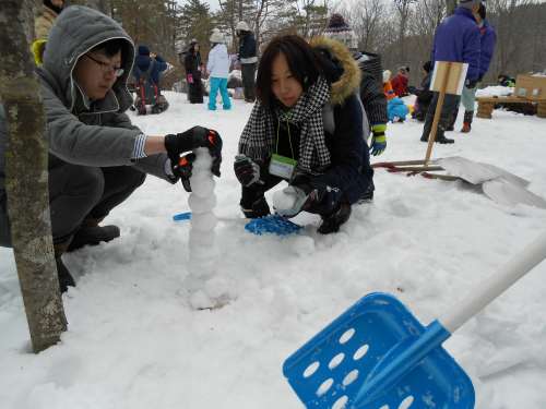 雪玉を的に當てたり、雪玉を積み上げて高さを競ったり、ドッジボール場ほどの雪面に埋められた寶物を探したり、子供達はもちろん親達も本気になって取り組んでいました。