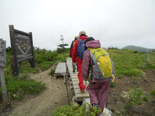 出発してすぐに、県境を越えて山形県上山市に入ります。 歩き始めて約5分、すぐにお花畑へ向かう木道が現れました。 高山植物のお花畑を見るためには、何時間も登ったり下ったりしながらやっと見られるものだという先入観があったので、とにかくビックリ! 近くにこんな素晴らしい場所があったんですね。