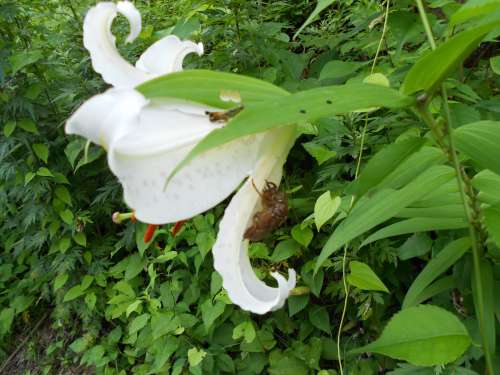 我が家の前の道路の斜面に咲いていたヤマユリの裏側に、セミの抜け殻がくっついており、その上にはイナゴが止まっていました。 思わずニンマリする構図です。 この狀況を形作るものについて、珍しいものは何一つないのですが、自然というものは、時々楽しく思えることを作り出してくれるんだなあと気づかされます。