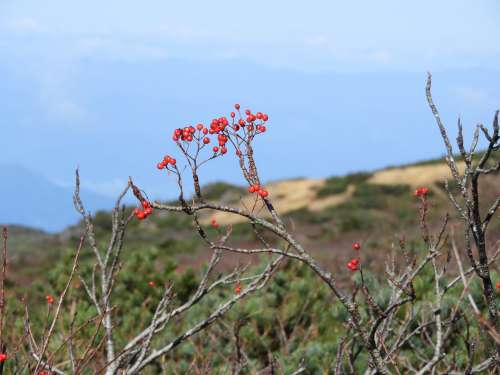 葉をすべて落としたナナカマド。 刈田岳山頂に鎮座する刈田嶺神社、奧宮。